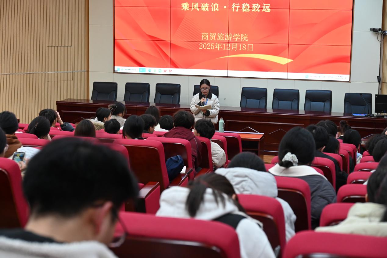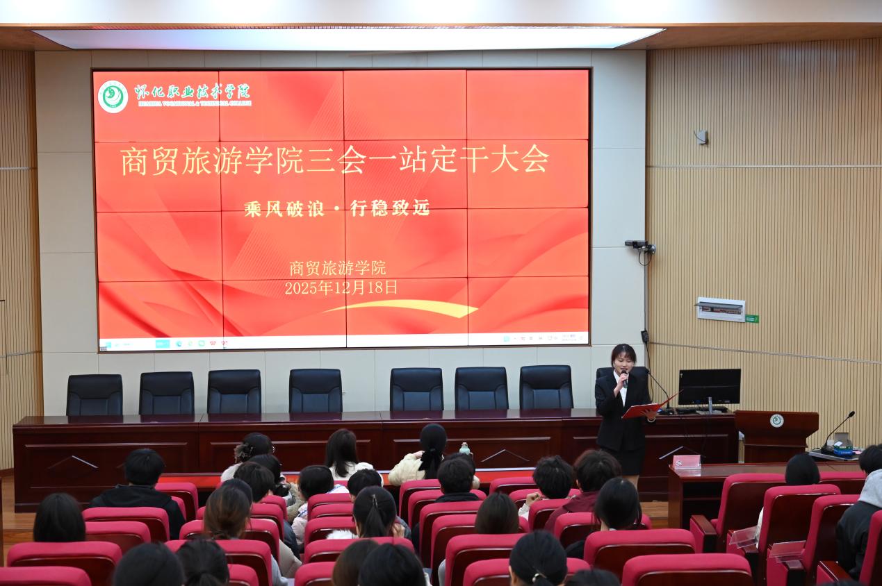 2025年12月18日,为进一步完善学生组织建设,推动学院“三会一站”工作持续发展,商贸旅游学院隆重召开“三会一站”定干大会。学院副院长黄双双、指导老师刘姚欧、25级辅导员代表蒯昔昆受邀出席,新一届学生骨干候选人依次登台竞选,为学院学生工作注入全新活力。
