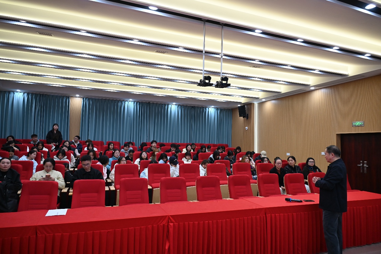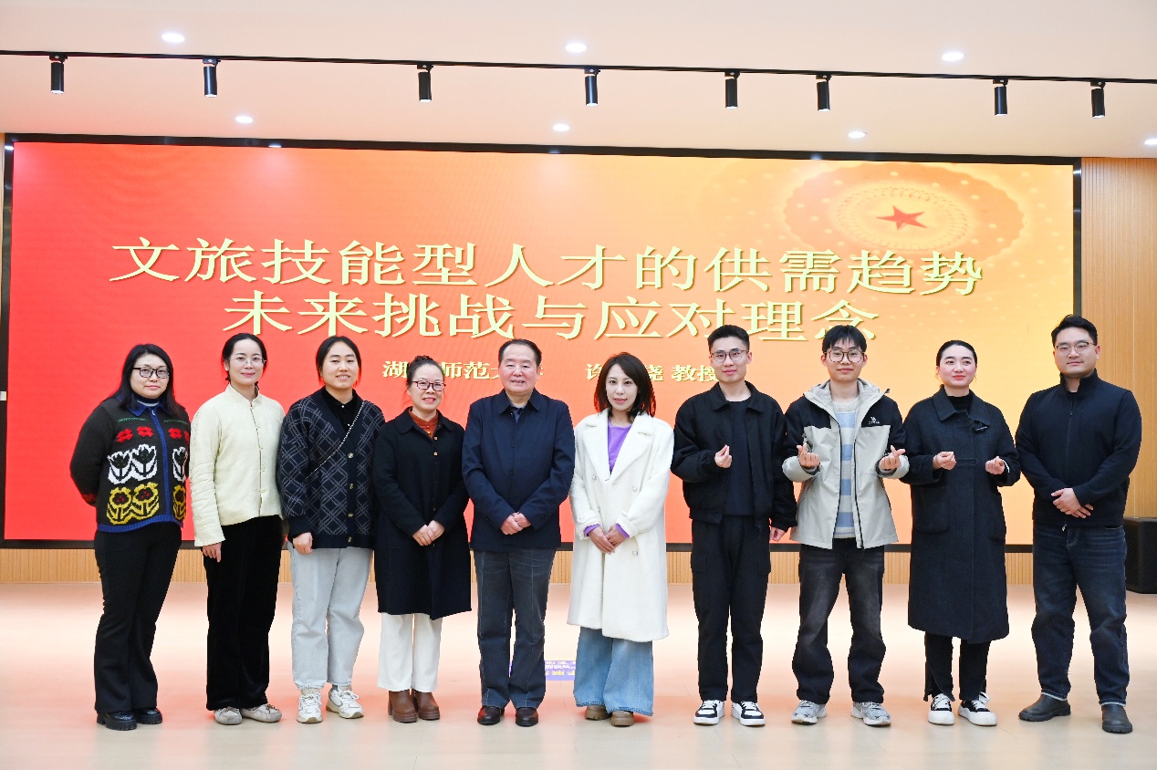 2025年12月18日下午4点,商贸旅游学院于双创楼101教室开展文旅人才发展专题讲座,特邀湖南师范大学许春晓教授担任主讲人,主题为“文旅技能型人才的供需趋势、未来挑战与应对理念”,旅游专业教师全员参与,其他专业无课教师也到场聆听交流。